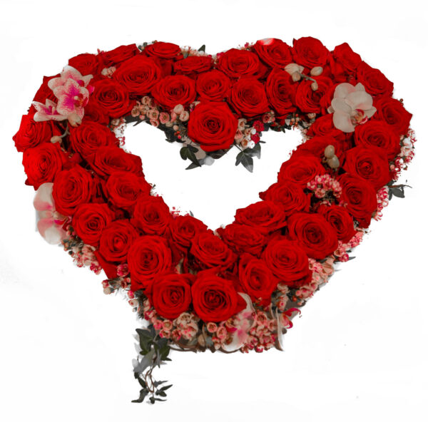 Hjärta med röda rosor, orkidéer och rosa vaxblomma. Bredd på hjärtat 55cm. Blommorna kan variera under årets olika årstider.