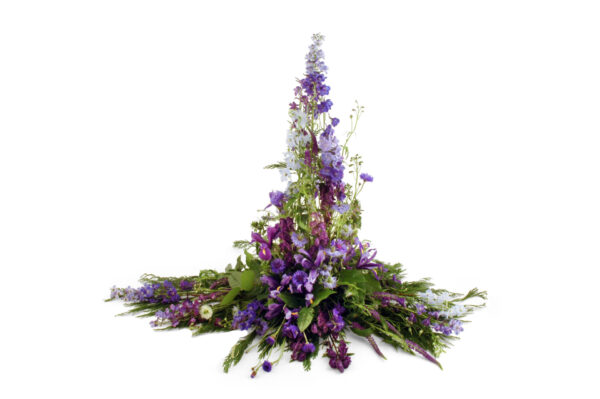 Begravningsdekoration i blått. Blommorna varierar under årets olika årstider.