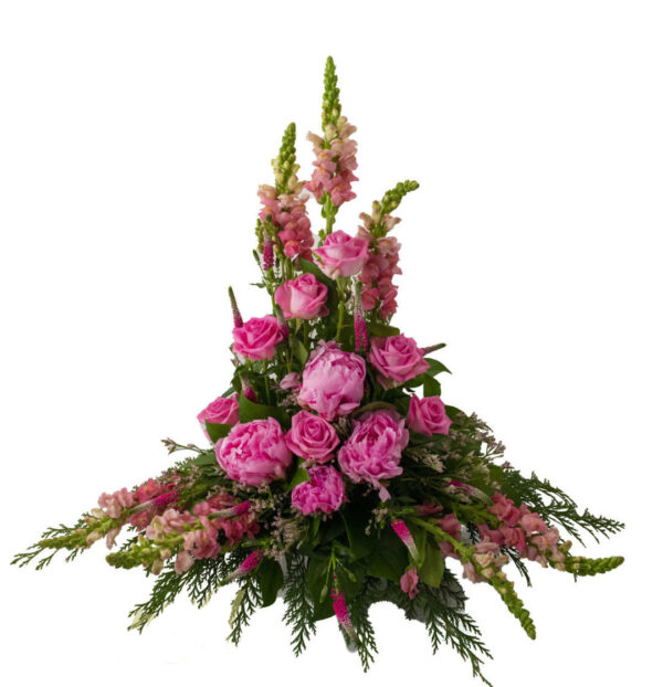 Begravningsdekoration i rosa. Blommorna varierar under årets olika årstider.
