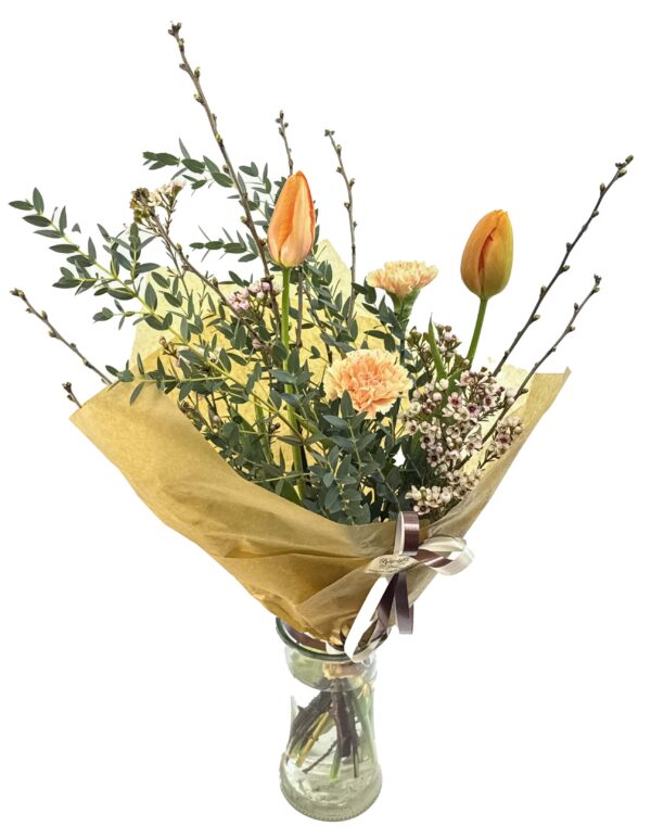 Februaribuketten innehåller bla franska tulpaner nejlika och körsbärskvistar